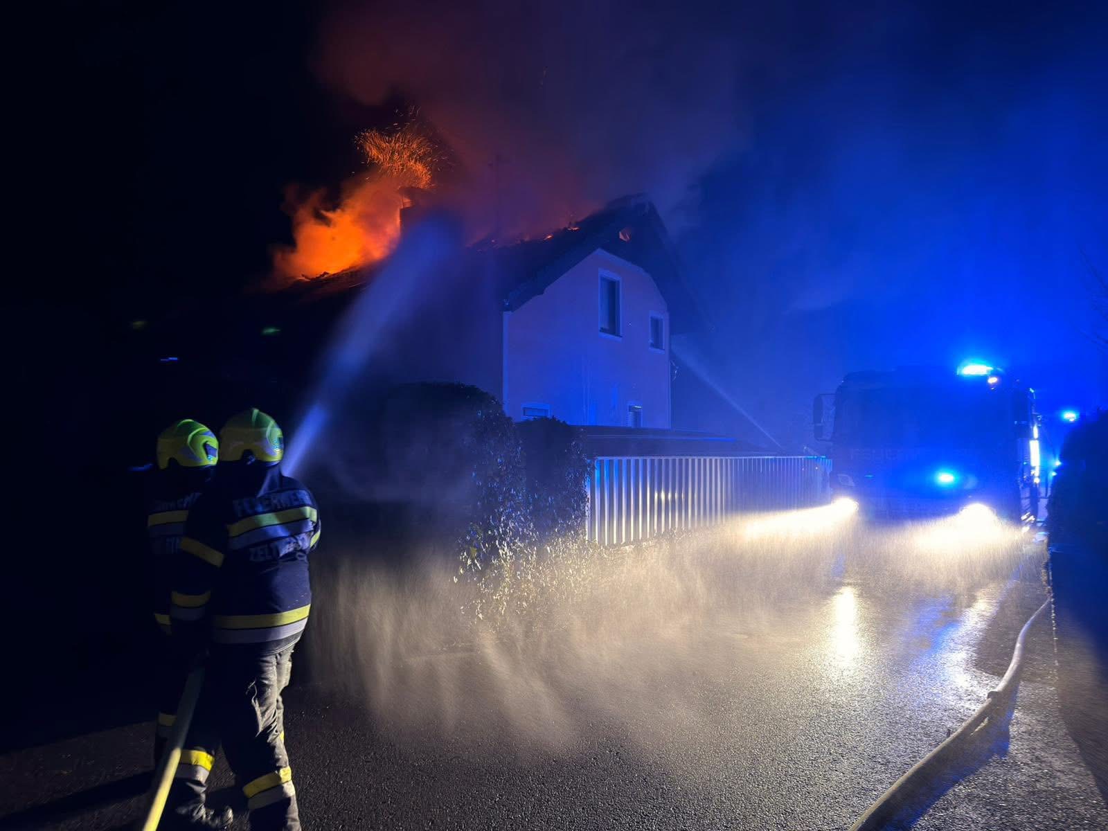 Beim Eintreffen der ersten Einsatzkräfte vor Ort bestätigte sich schließlich dieses Lagebild. Meterhohe Flamen schlugen aus dem Dachstuhl sowie dem Obergeschoss eines Einfamilienhausese und drohten sich rasch weiter auszubreiten. Unter der Einsatzleitung von ABI Christoph Quinz wurde umgehend ein umfassender Löschangriff eingeleitet. Ein Vordringen im Innenangriff war jedoch aufgrund der bereits einstürzenden Dachkonstruktion nicht mehr möglich. Für eine gezielte Löscheinwirkung wurde hierfür ein Außenangriff über die Drehleiter vorgenommen. Der Einsatz für die zahlreichen Atemschutzgeräteträger wurde durch den Atemschutzstützpunkt der Betriebsfeuerwehr Stahl Judenburg unterstützt.